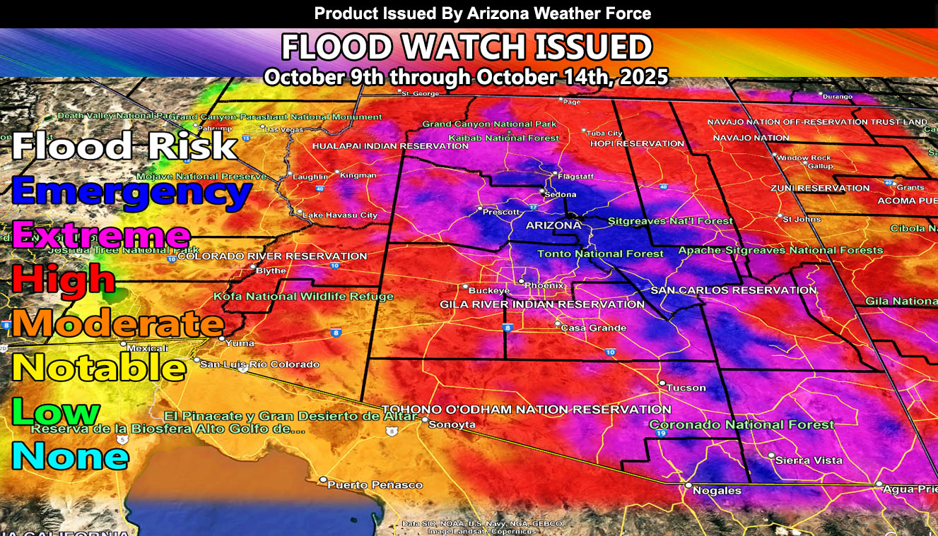 Arizona Weather Force has officially upgraded the Long Range Weather Watch issued last week to a Flood Watch and Flood Emergency for the entire state of Arizona, effective October 9th through October 14th, 2025.