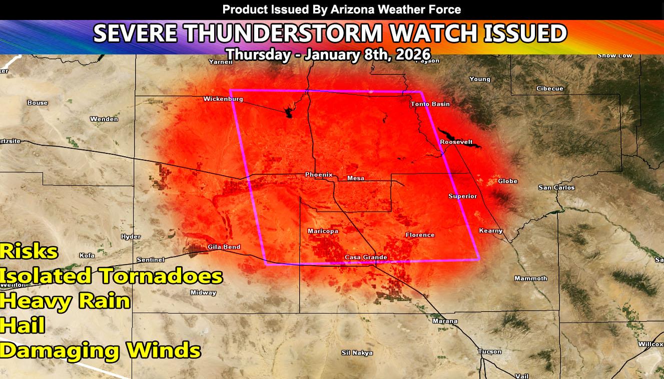 Arizona Weather Force has issued a Severe Thunderstorm Watch effective now for Maricopa and Pinal County, through the afternoon and evening.