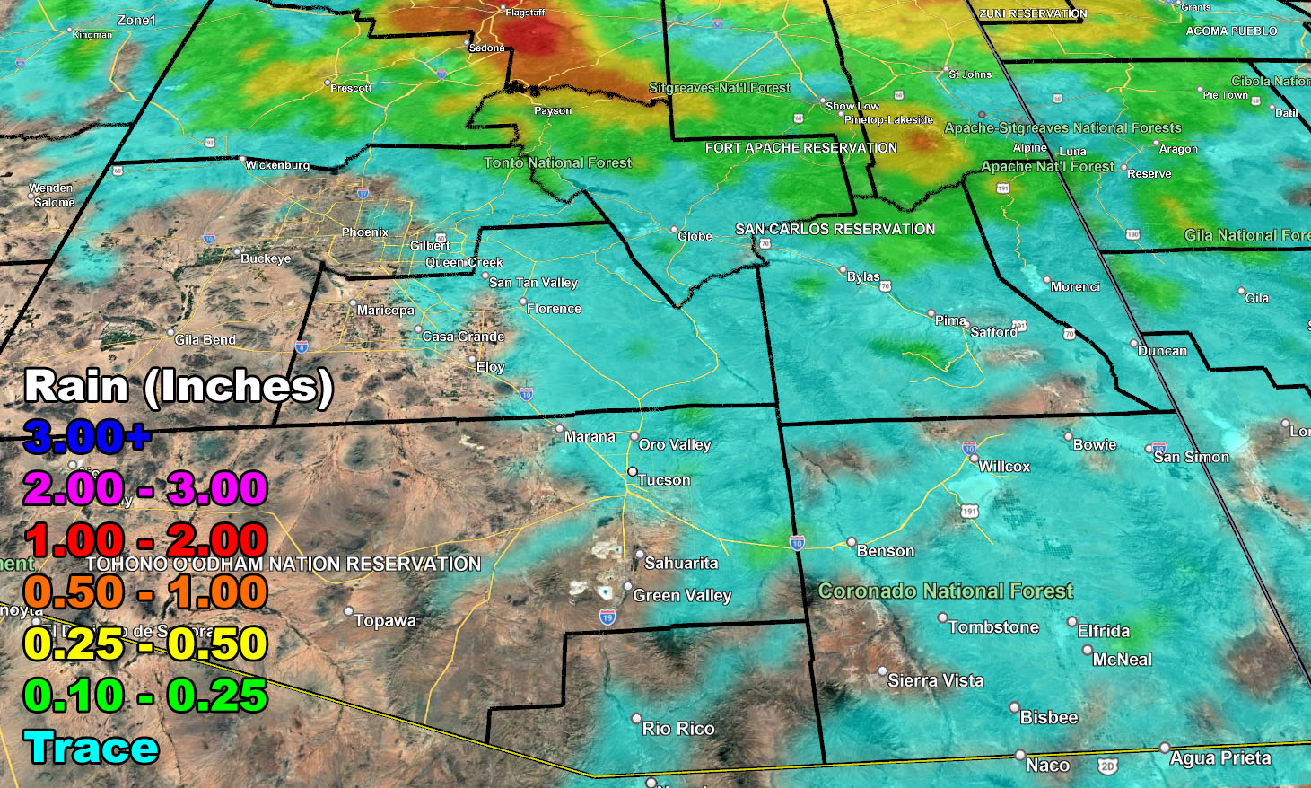 The final zoom-in rainfall maps paints a picture that the Northern half of Arizona will see the most action from this system today into Wednesday morning.  This will be a two part system.  The first part will be the southwest to northeast flow over Yavapai County, stretching from Wenden and Wickenburg, north and northeast directly over the Prescott forecast zones, and ending near the Sedona forecast area.  A large part of Yavapai County will seen thunderstorms today, which means that Arizona Weather Force has issued the official Thunderstorm Watch as the focus spot until around later evening.