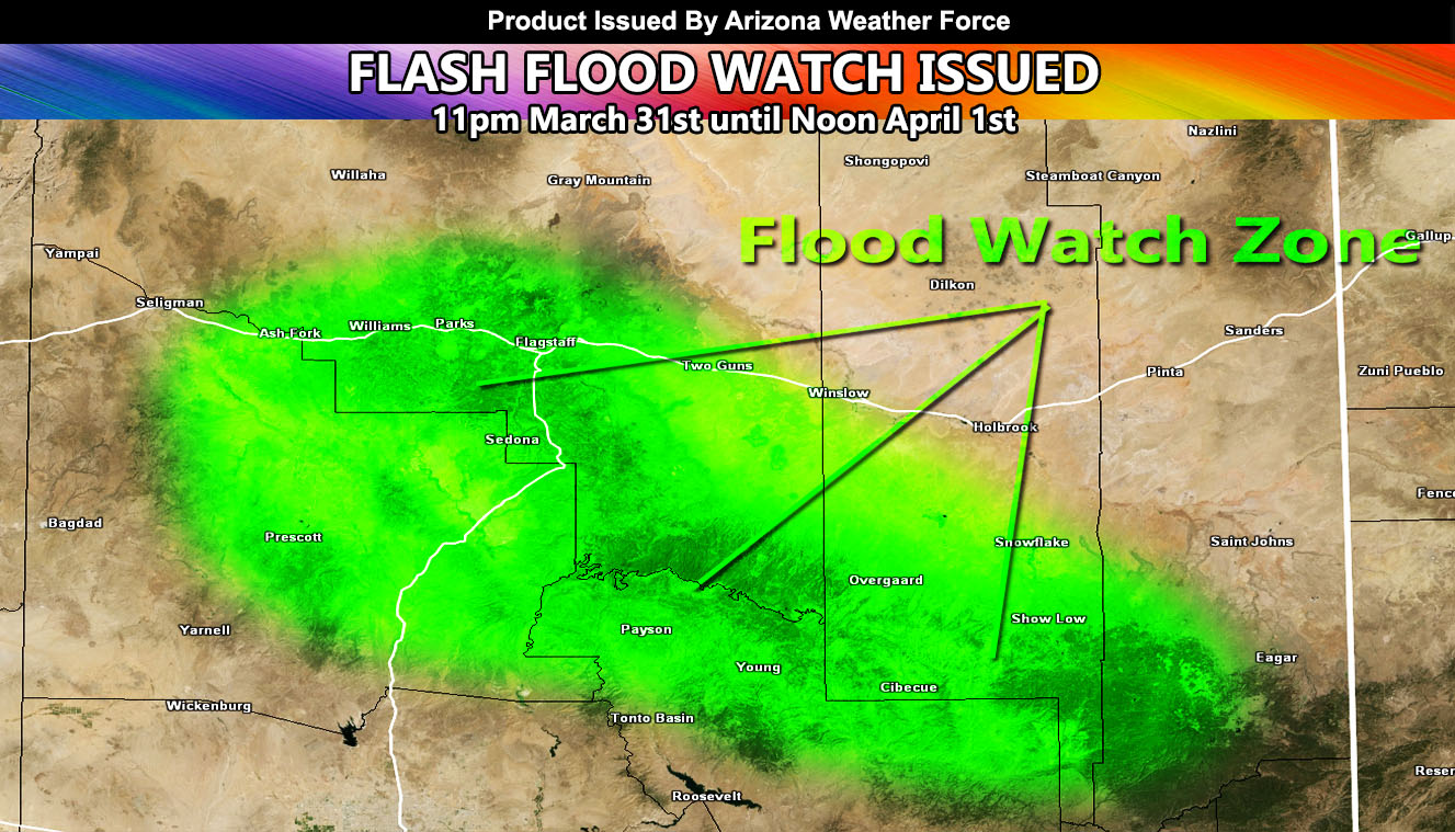 Arizona Weather Force has issued a Flash Flood Watch, effective Tuesday into Wednesday, March 31st to April 1st, 2026, for the following zones;