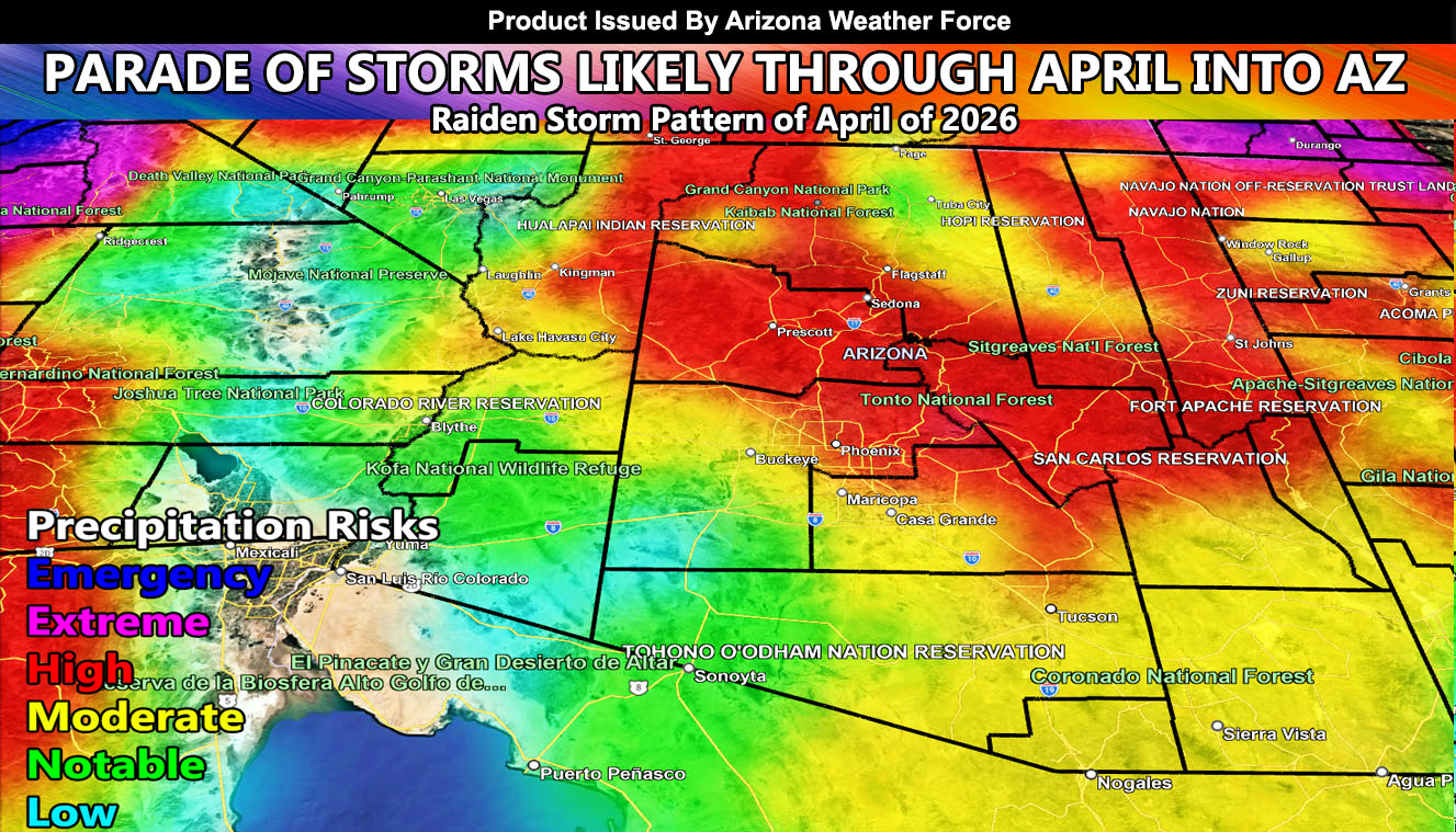 A Raiden Storm Pattern means that no other source (Including AZWF Partners) is predicting what pattern in the super long range numbers are showing here at Arizona Weather Force, aptly named by who discovered it, and that ‘other sources’ will overtime only parrot what you just read here ahead of time. If you rely on a long range forecast for rainfall due to agriculture or other means, you are remaining in the right place. The coming series of storms will be called the Raiden Storm Pattern of April 2026, which looks significant.