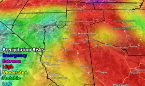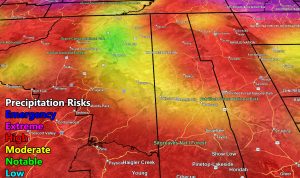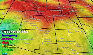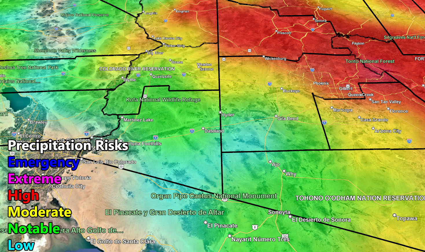 Locations: The map is quite clear in showing the higher terrain will see the high risk zones, but you can also see the terrain influence from the high terrain called orographic lifting, south of the mountains for moderate to high risk in the metros of Maricopa, Pinal, Pima, Cochise, Greenlee, and Graham County as well.