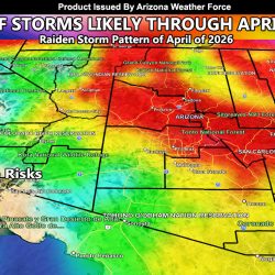 Apache County Red Rock Apache County Sanders Apache County Steamboat Canyon Arizona Mountains Alpine Arizona Mountains Bagdad 4000 Arizona Mountains Camp Verde 3100 Arizona Mountains Cibecue 5000 Arizona Mountains Heber-Overgaard 6500 Arizona Mountains Mount Baldy Resort 9000 Arizona Mountains Seligman 5200 Arizona Mountains Show Low 6400 Arizona Mountains Spring Valley 4000 Arizona Mountains Strawberry 6000 Arizona Mountains Yarnell 4800 Coconino County Kaibito Coconino County Page Coconino County Tuba City Coconino County Williams Colorado River Lake Mead Hoover Dam Gila County Tonto Basin Las Vegas Metro Maricopa County Chandler Maricopa County Mesa Maricopa County New River Maricopa County Rio Verde Mohave County Dolan Springs Mohave County Yucca Navajo County Kayenta Pima County Catalina Mountains Pima County Sahuarita Pima County Vail Pinal County Apache Junction Pinal County Maricopa Pinal County Oracle Pinal County San Tan Valley Yavapai County Black Canyon City Multiple Rounds of Storms Will Hit Arizona Through The Rest of April; Raiden Storm Pattern April 6, 2026 by Weather 0 comments Continue Reading →